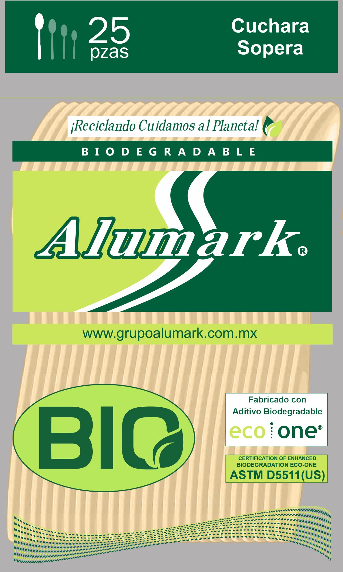 Pack con 100 cucharas soperas en 4 paquetes de 25 piezas c/u Elaboradas parcialmente con bioplastico biobasado de origen vegetal, con material 100% reciclado de primera y con aditivo biodegradable Eco One* Certificación de biodegradabilidad ASTM D5511 (US)