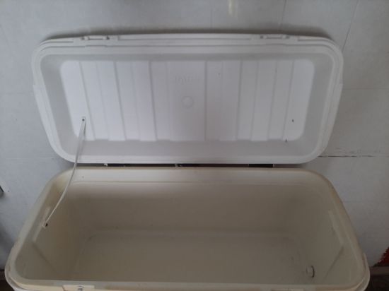 Marca Igloo. Caja de plástico color blanco. 114 litros. Asas de transporte abatible reforsadas. Tapón de drenado para conectar manguera. Conserva hielo hasta 5 días a 32.22° (90°F). Producto de doble uso pero en buenas condiciones.