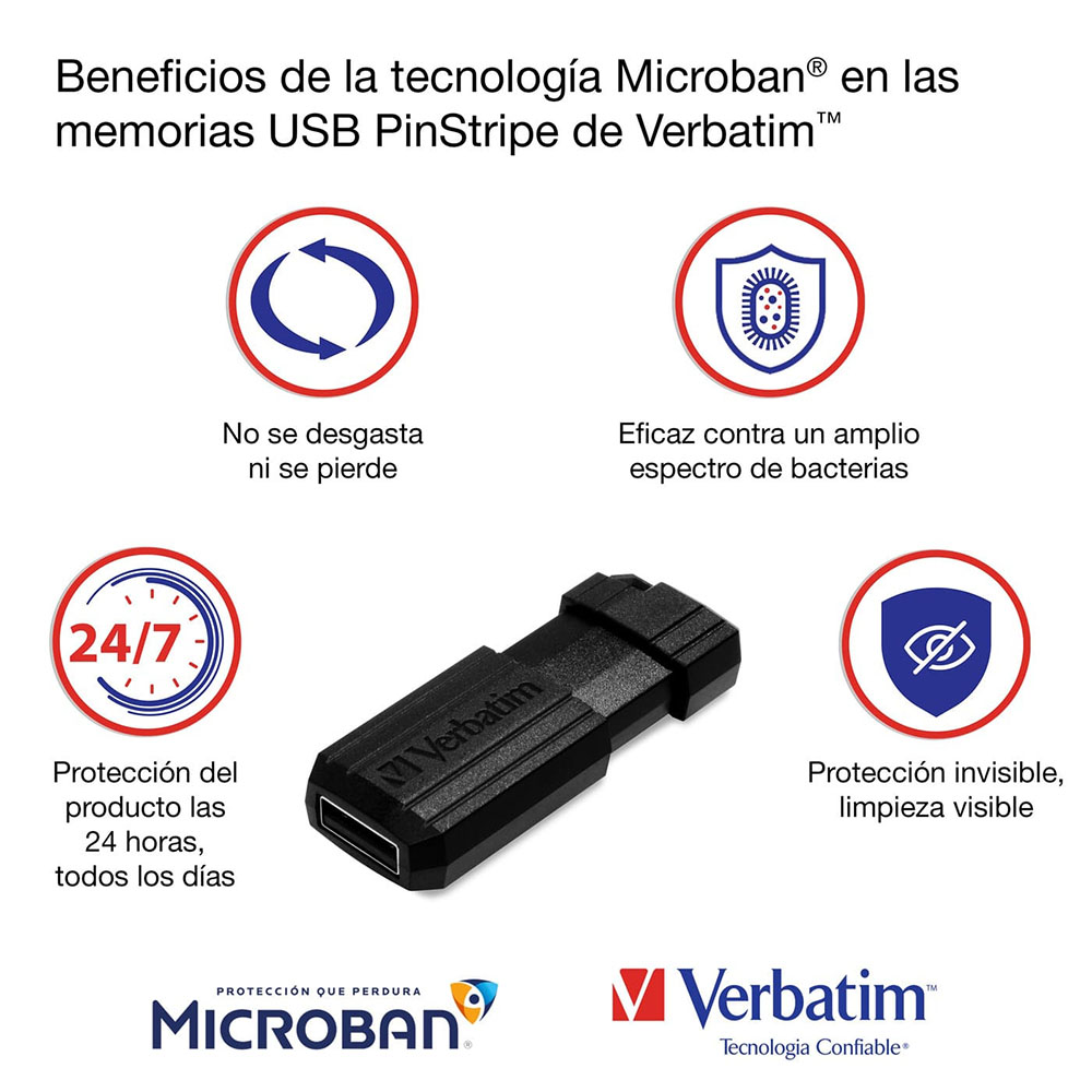 Las memorias USB de Verbatim integran al producto la protección antibacteriana de Microban®. ¡Esta tecnología antibacteriana ayuda a prevenir el desarrollo de bacterias, para que tus memorias USB permanezcan limpias por más tiempo!