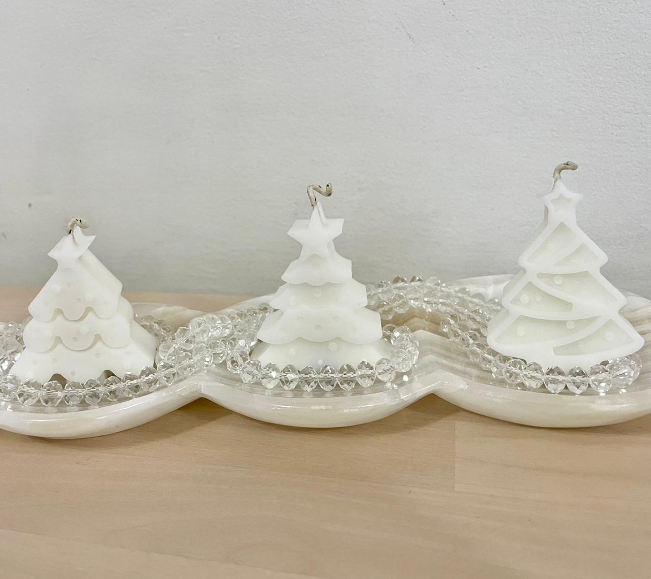 Velas aromáticas de pequeños árboles navideños, con aroma a pino fresco.