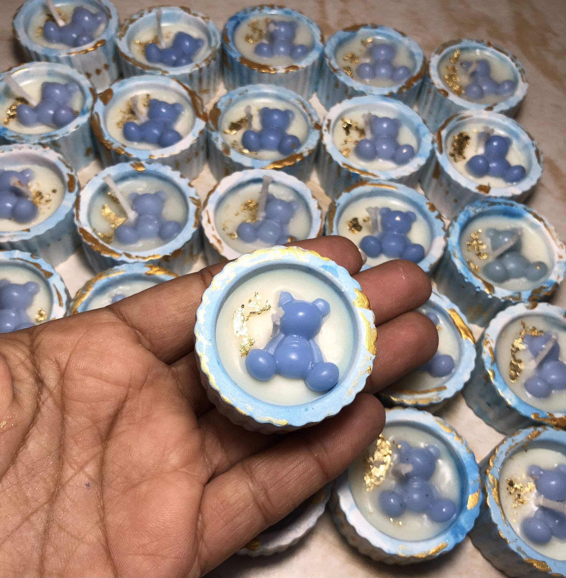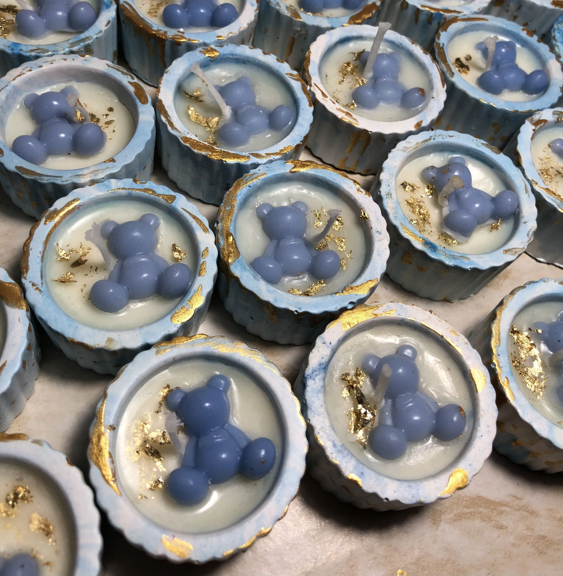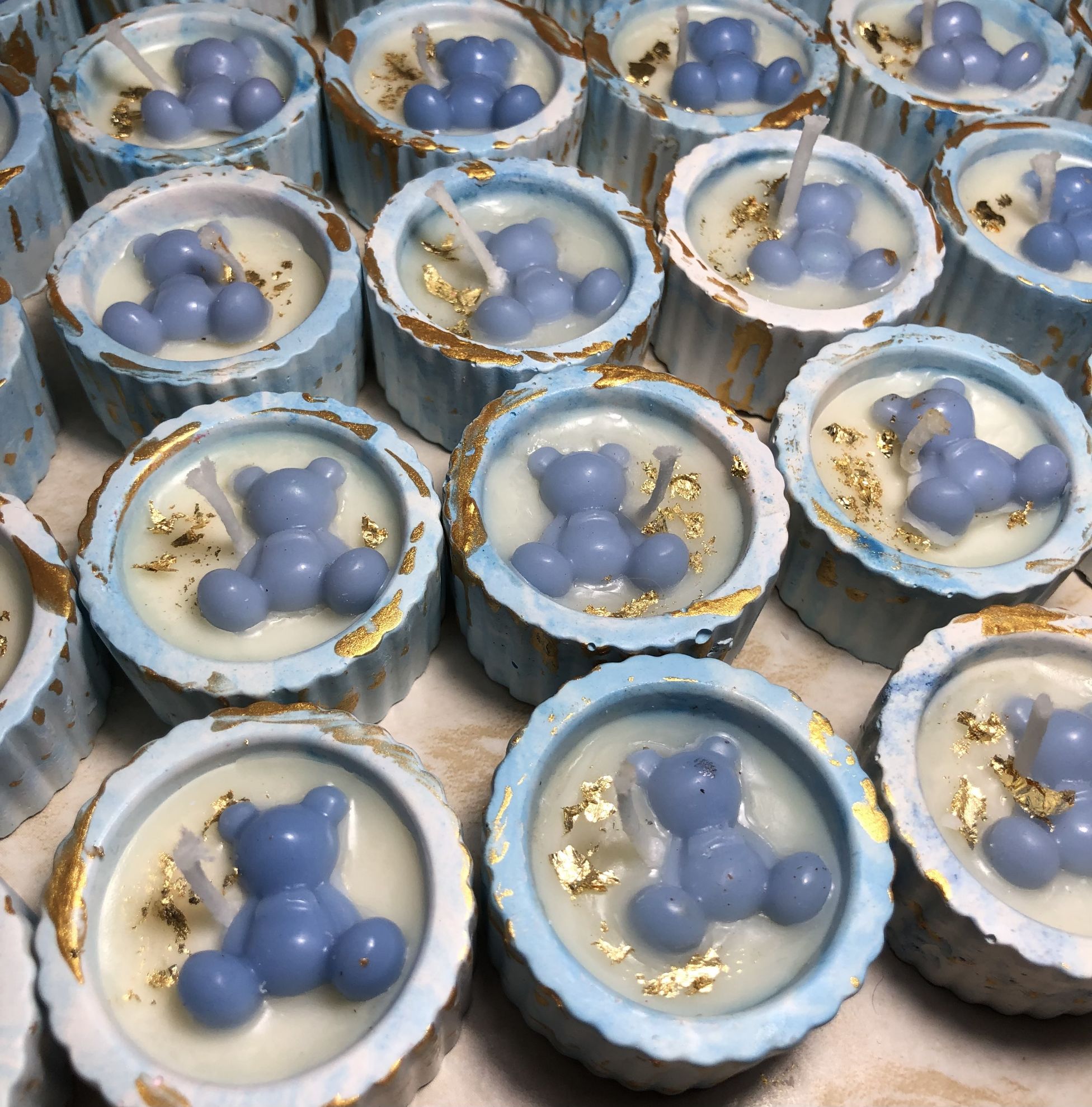 Velas aromáticas mini celeste mármol detalles dorados para recordatorios de Baby Shower, decorada con osito celeste y hoja de oro