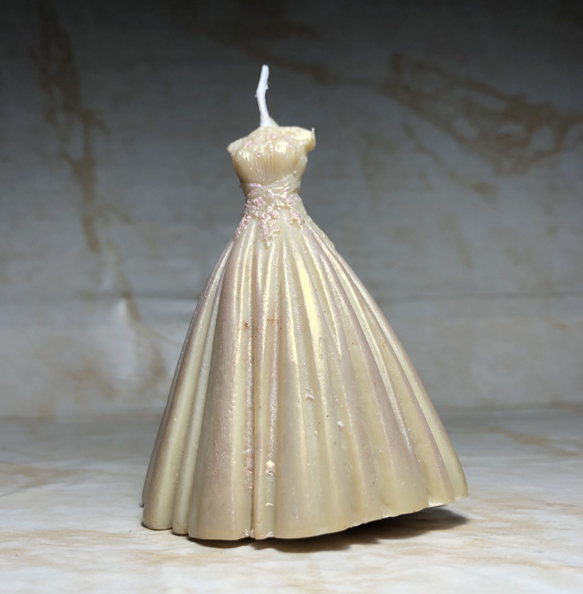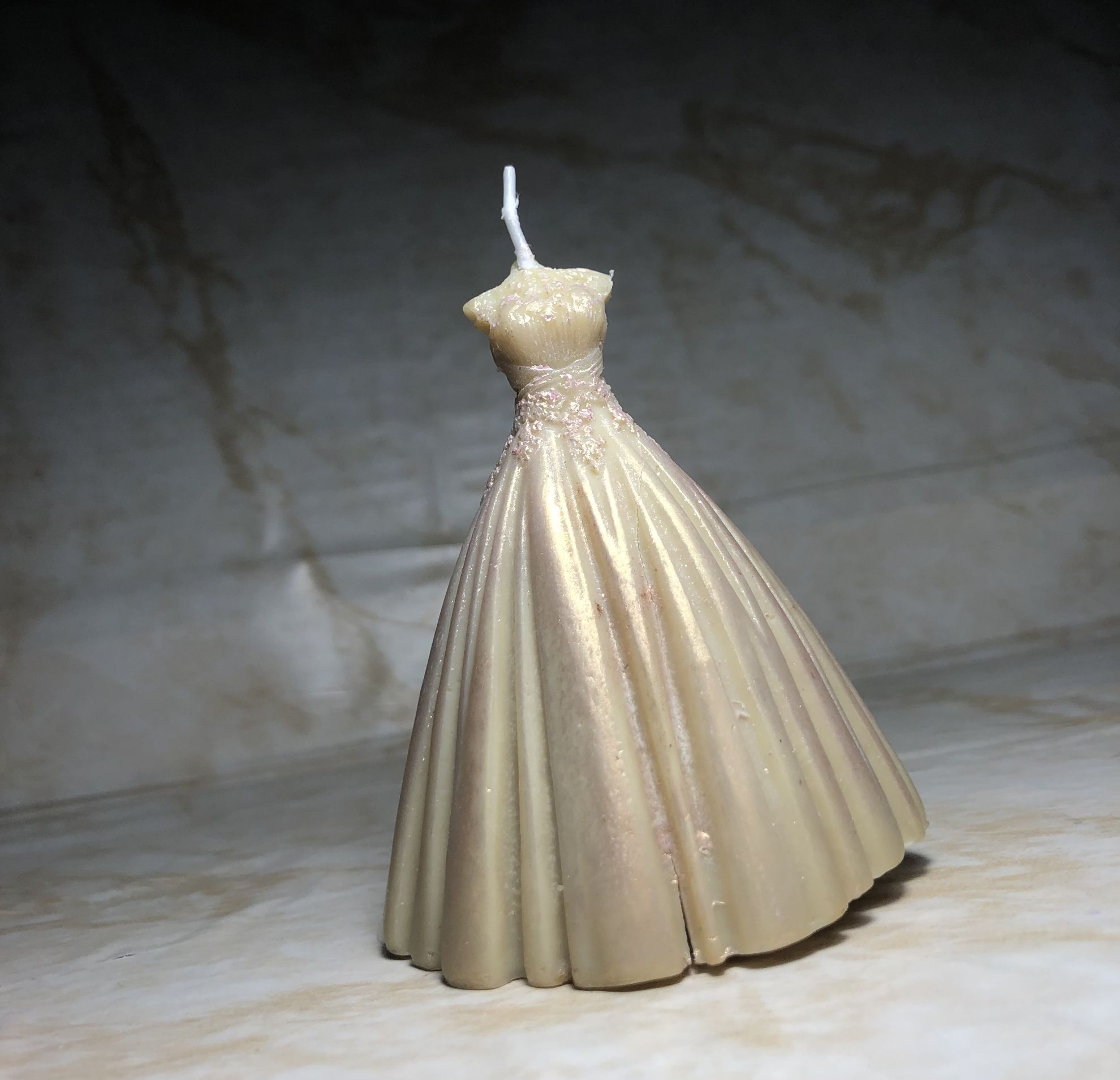 Vela aromática VESTIDO XV años ideales para recordatorios o como complemento para centros de mesa, color del vestido beige con brillo en polvo dorado-plata.
